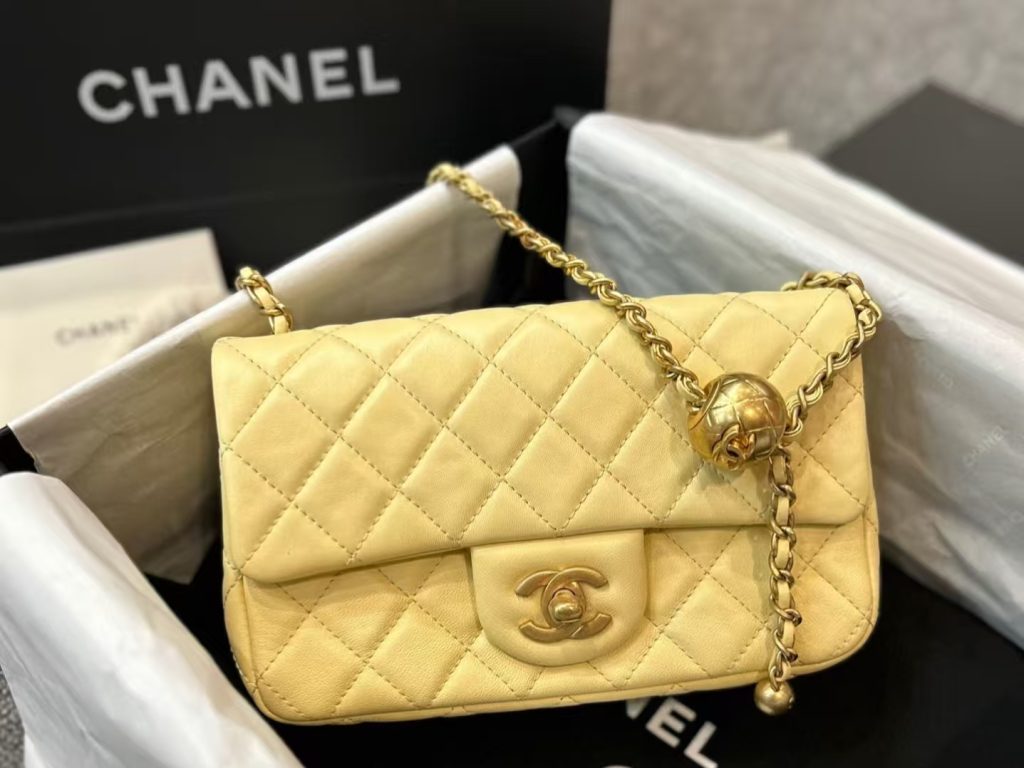 The pale yellow color is incredibly gentle, often called “chicken yellow”! It features a classic diamond pattern and is made of soft, supple lambskin, with gold hardware that adds a touch of luxury. The metal ball on the chain is adjustable, allowing for shoulder or crossbody wear. Compact yet surprisingly spacious, it easily holds your phone and lipstick, making it a versatile everyday accessory!